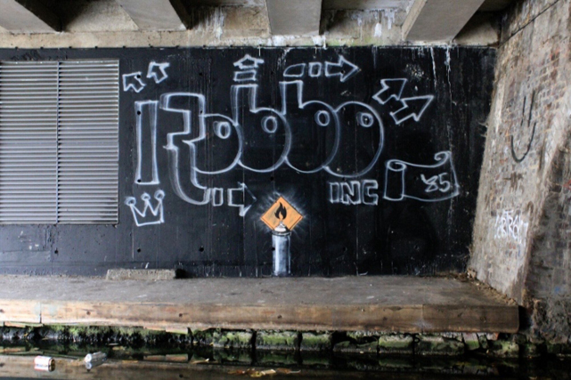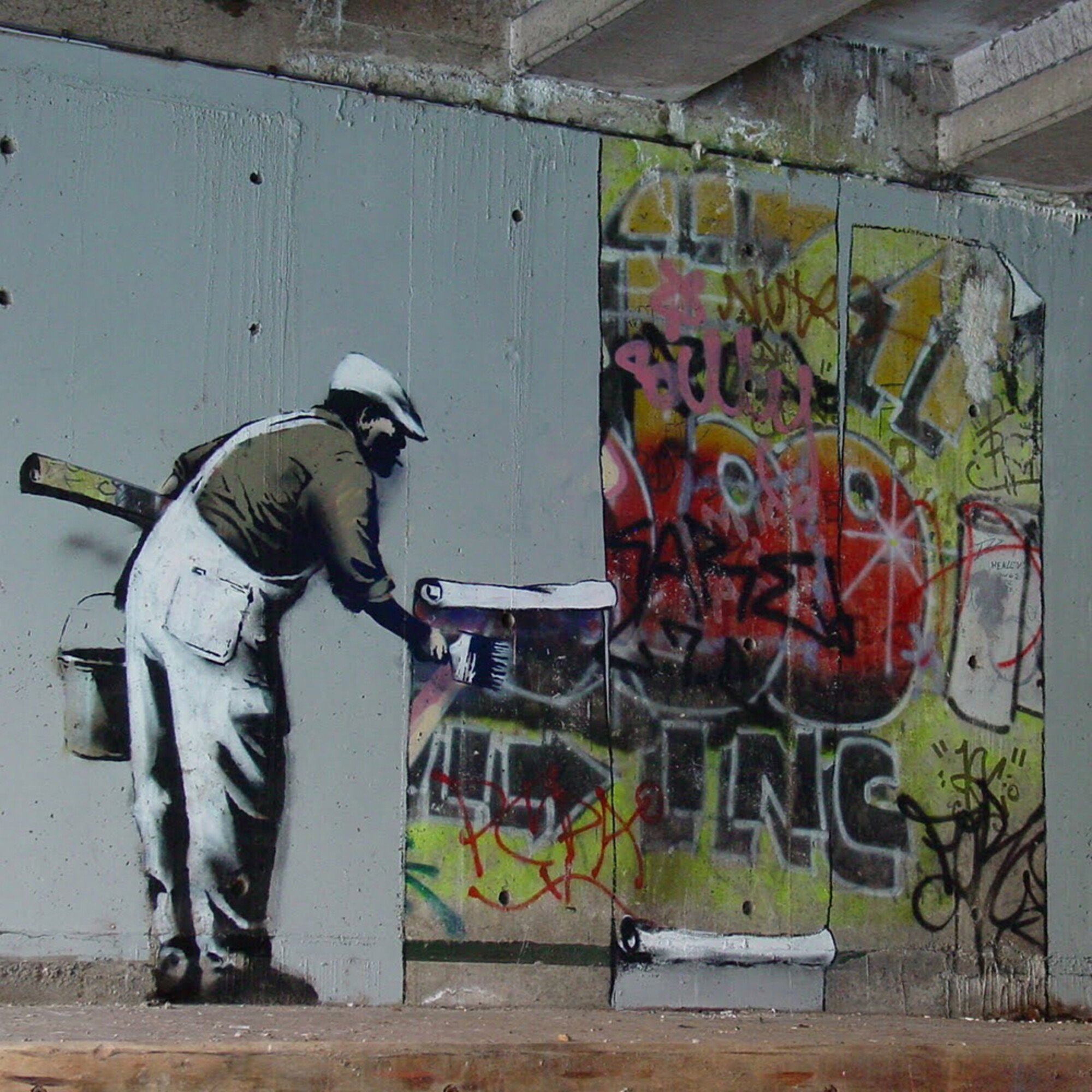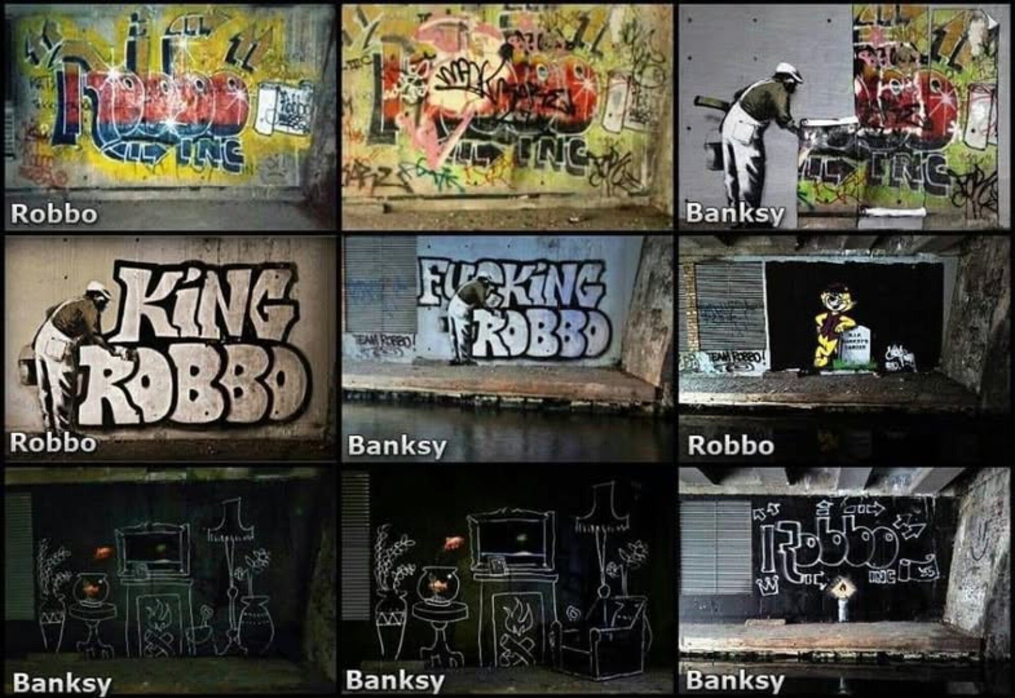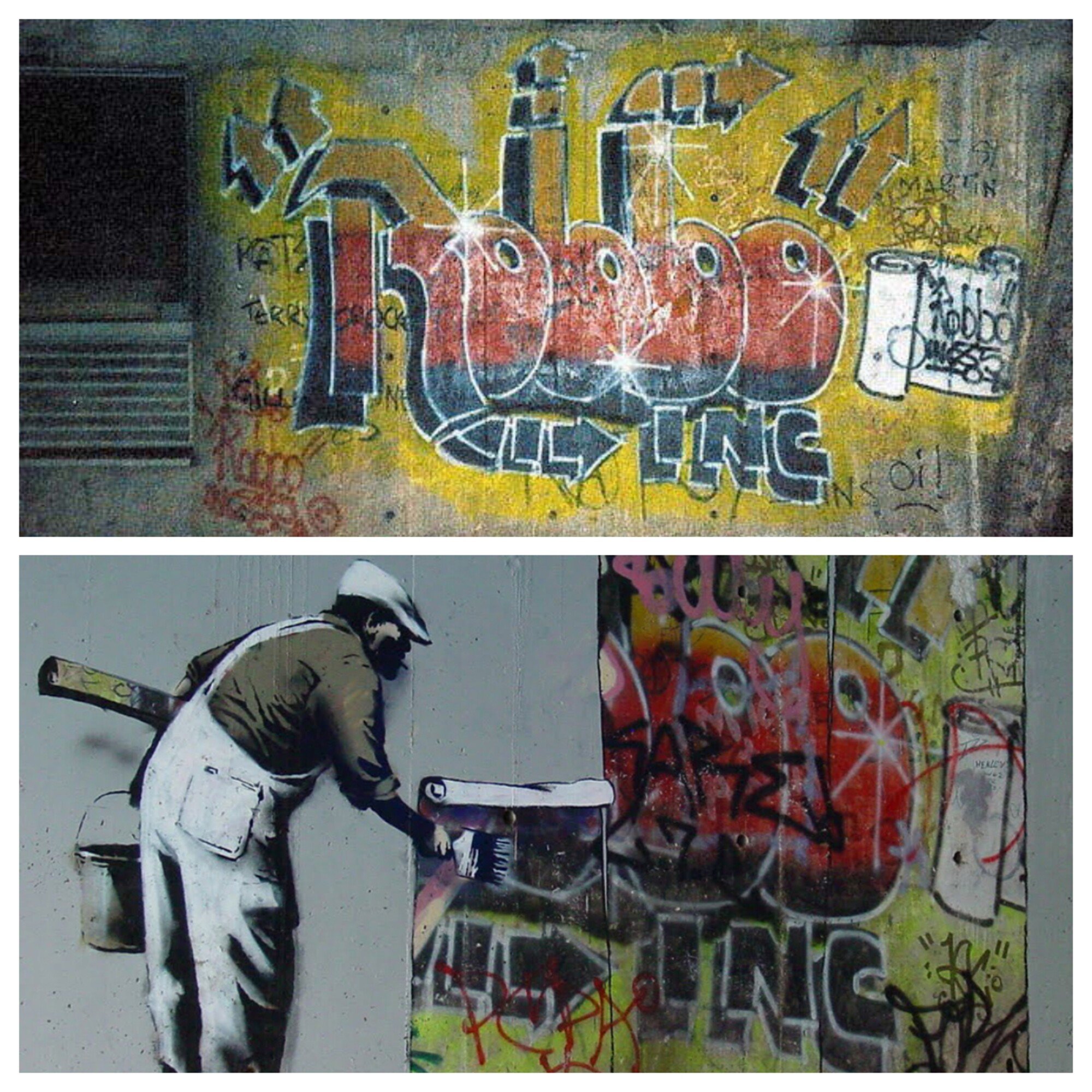 Původní verze od Kinga Robba z roku 1985 a po přesprejovaní od Banksyho.